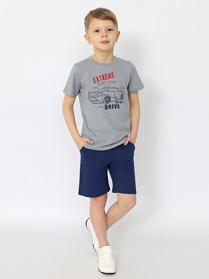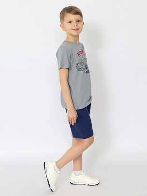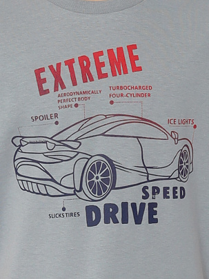 Футболка с коротким рукавом. Горловина круглая, обработана узким воротником из полотна с эластаном. Перед оформлен принтом.
